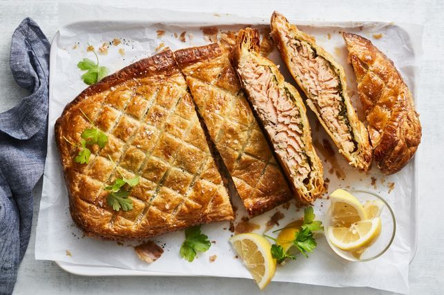Brush pastry with egg. Lightly score the top of the wellington at 2cm intervals in a diamond pattern. Season with salt and pepper. Bake for 35 minutes or until pastry is golden and puffed and salmon is almost cooked through. Stand 5 minutes. Sprinkle with extra parsley and serve with lemon wedges.