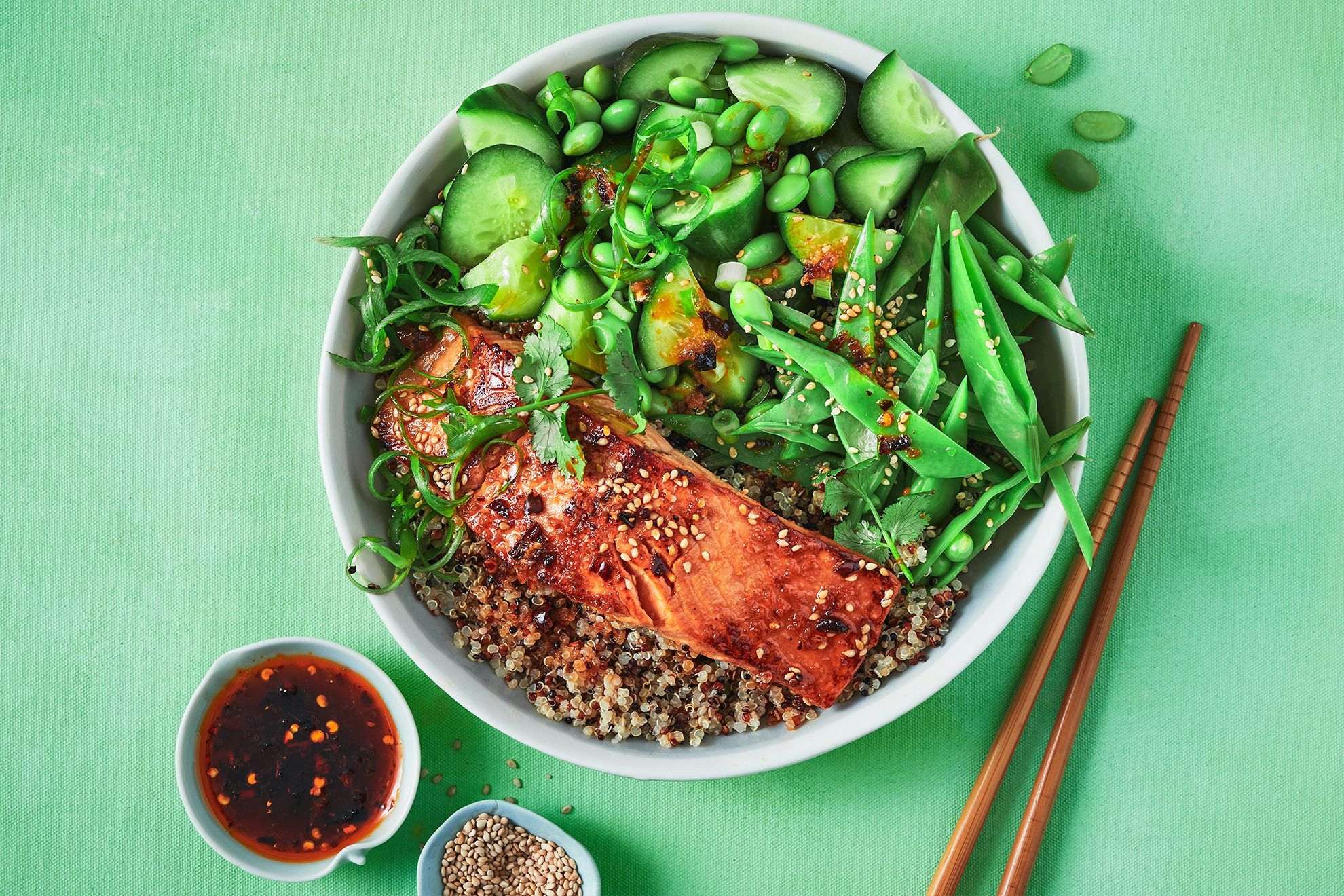 Combine edamame mixture, cucumber, shallot and coriander in a large bowl. Divide quinoa, cucumber salad and salmon among shallow serving bowls. Drizzle with chilli oil mixture and sprinkle with sesame seeds, to serve.