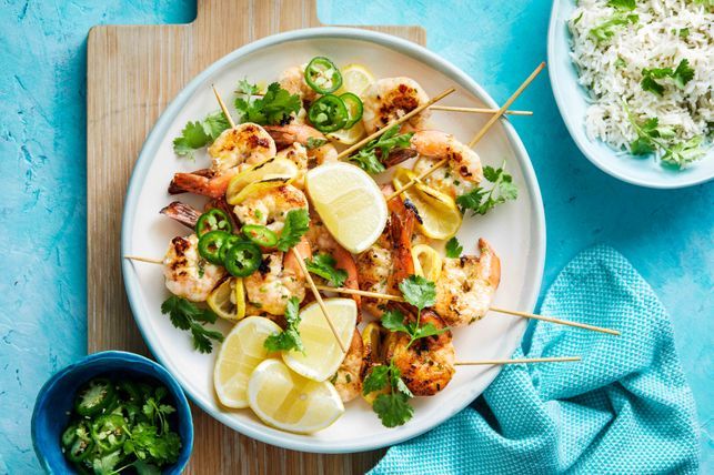 Add remaining coriander to rice. Season with salt and pepper. Fluff with a fork to separate grains. Sprinkle skewers with extra chilli and coriander leaves. Serve with coconut rice and lemon wedges.