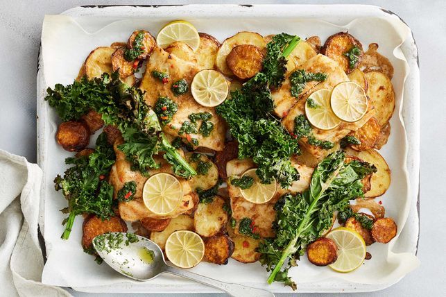 Place potatoes on prepared tray. Bake for 10 minutes. Place kale, fish and lime slices on vegetables. Drizzle vegetables with any remaining coconut mixture in bowl. Bake for a further 15 minutes or until fish is just cooked through and vegetables are tender.